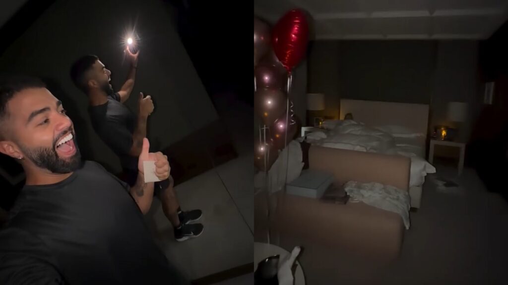 O vídeo da visita inesperada rapidamente revelou a ambientação carinhosa do quarto, que estava repleto de balões de gás, incluindo modelos em formato de coração, e velas acesas.
