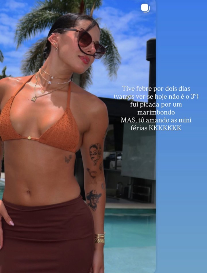 A artista relatou que sofreu uma picada de marimbondo e acabou tendo febre por dois dias. Em publicação nos Stories do Instagram, Ana comentou o susto, mas manteve o bom humor ao falar do descanso. “Fiquei com febre por dois dias, espero que hoje não seja o terceiro. Levei uma picada de marimbondo, mas estou amando essas miniférias”, disse.