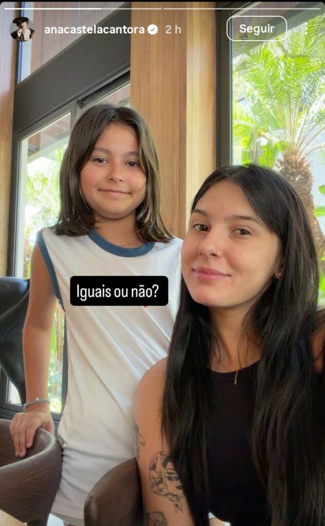 Ana Castela, de 22 anos, compartilhou nesta quinta-feira (27) uma foto ao lado da irmã caçula, Antonella, de 9 anos, chamando a atenção para a semelhança entre elas. No clique raro, as duas aparecem na mesma pose, e a cantora provocou os seguidores na legenda: “São iguais ou não?”.