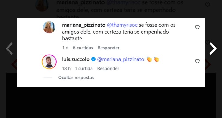 “Se fosse com os amigos dele, certamente teria se dedicado mais”, comentou uma internauta. A publicação recebeu resposta de Luis Zuccolo, que reagiu com emojis de aplausos.