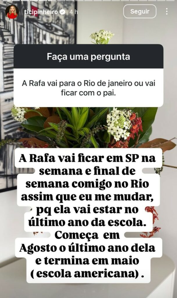 Ticiane confirmou que a filha mais velha continuará morando em São Paulo com o pai, Roberto Justus. Segundo a apresentadora, a adolescente passará os dias da semana na capital paulista e ficará com ela nos fins de semana, no Rio de Janeiro, assim que a mudança for concluída.