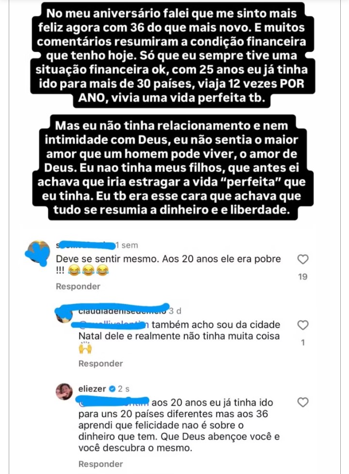 Ao comentar as reações recebidas após seu aniversário, Eliezer explicou que muitos associaram sua felicidade atual apenas à estabilidade financeira. Ele ponderou, porém, que mesmo na juventude já levava uma vida confortável, com muitas viagens internacionais e uma rotina que, à época, considerava ideal. Ainda assim, afirmou que algo essencial lhe faltava.