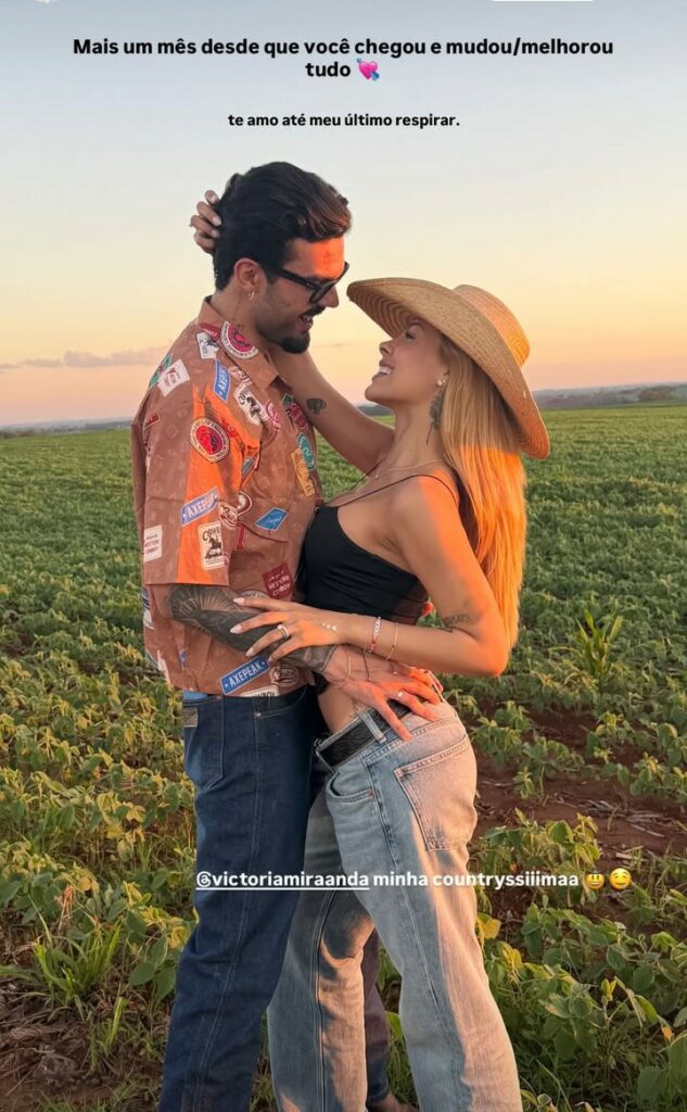 Luan Pereira, de 22 anos, comemorou nesta quarta-feira (3) os dois meses de namoro com Victória Miranda, também de 22. Pelas redes sociais, o cantor sertanejo celebrou a data especial e publicou uma mensagem carinhosa para a influenciadora. Na declaração, ele destacou o quanto a relação transformou sua rotina: “Mais um mês desde que você chegou e melhorou tudo. Te amo até meu último respirar”, escreveu.