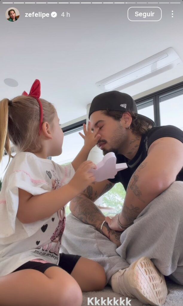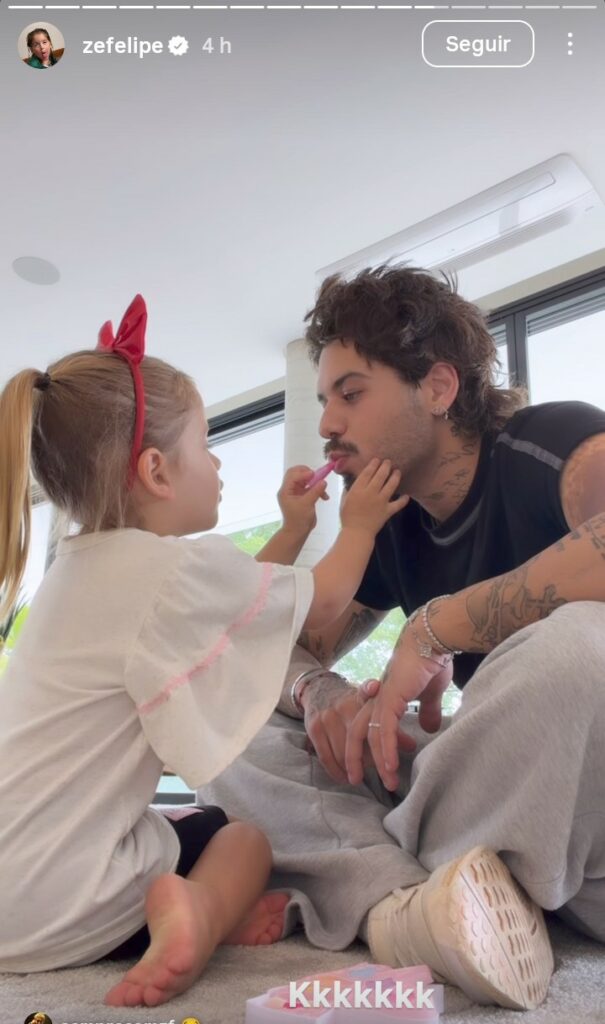 Na postagem, Zé Felipe inicia a brincadeira perguntando à filha: “Você quer maquiar o papai?”, recebendo um animado “Sim!” como resposta. Ao questionar qual produto ela pretendia usar, Maria Flor não hesita: “Rosa”. Entrando no clima, o cantor ainda pergunta, em tom divertido, se o “salão” improvisado também fazia cabelo: “Aqui você faz cabelo também ou só maquiagem?”, ao que a pequena confirma: “Cabelo.”