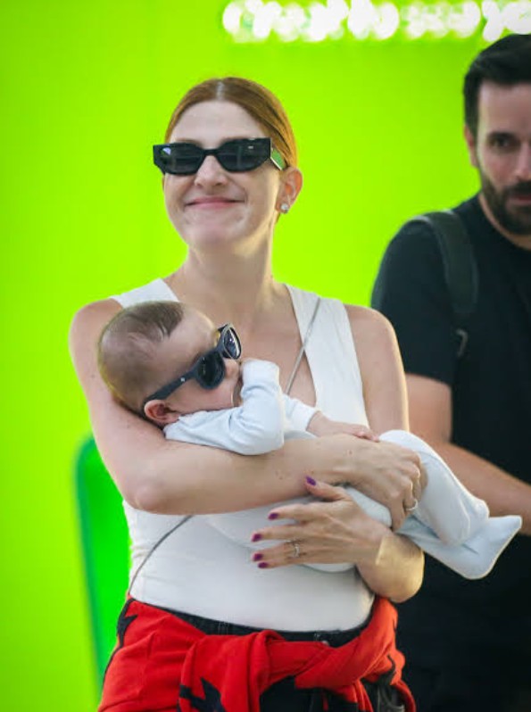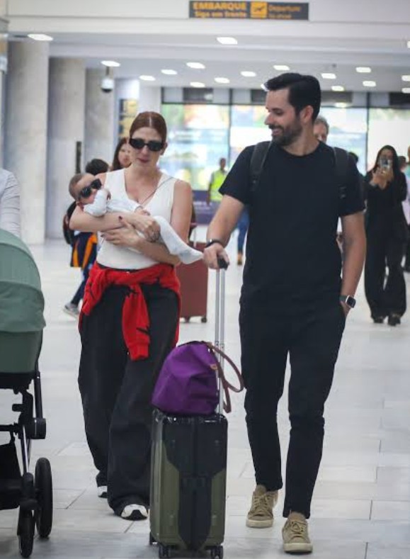 Durante a passagem pelo aeroporto com o filho, a humorista estava acompanhada do marido, Richard Neuman, e da babá do bebê. A família circulou pelo local de forma tranquila e demonstrando simpatia.