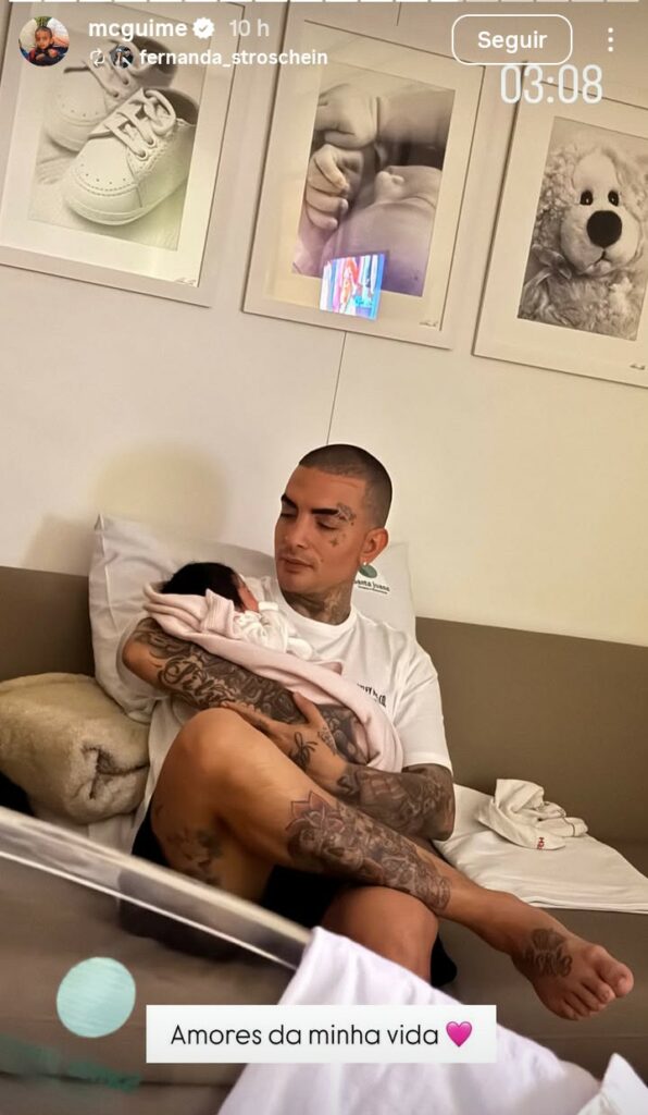 “Ela não deixa ninguém pegar no sono; chora e corre para o colo do papai. Só pensa em mamar”, contou o cantor, demonstrando encantamento com a pequena. O anúncio do nascimento foi feito em um post colaborativo no Instagram do casal. Priorizando a privacidade da filha, Guimê e Fernanda decidiram não revelar o rosto da bebê nos primeiros registros divulgados.
