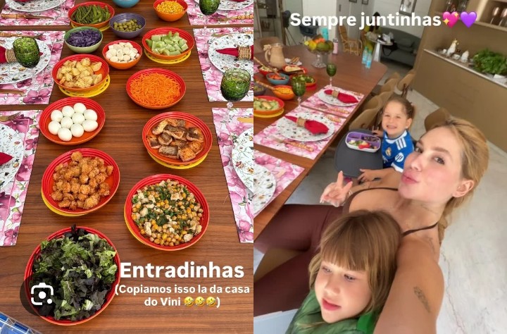 A empresária, que tem o hábito de almoçar ao lado da família, mostrou as pequenas porções distribuídas sobre a mesa e, na sequência, publicou uma foto com as filhas, já preparadas para a refeição. “Entradinhas. Copiamos isso da casa do Vini”, comentou em tom descontraído.