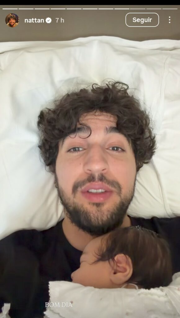 Na postagem, o cantor surge encantado ao apresentar a filha aos seguidores. “Bom dia, apresento a vocês a rainha Elizabeth III”, disse, em tom de brincadeira, enquanto filmava o rosto da bebê. Em seguida, emocionado, comentou sobre a fofura do momento e se declarou, destacando o quanto é impossível não se apaixonar ao vê-la dormindo. ‘Olha aí o jeito que dormiu. Oh meu Deus”, declarou Nattan.