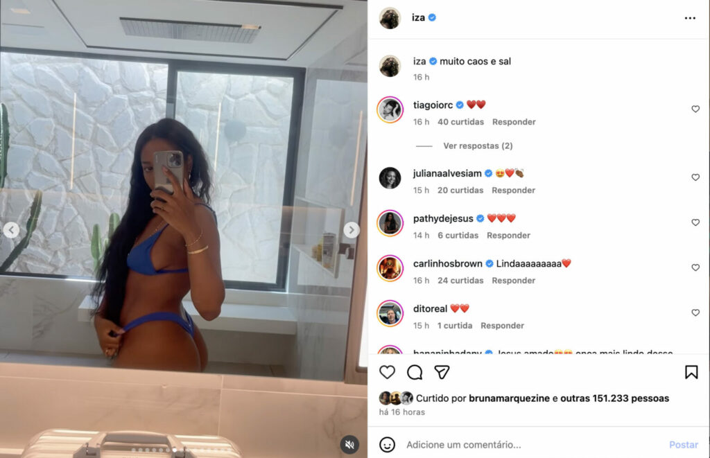 A cantora Iza chamou atenção dos seguidores ao compartilhar uma nova publicação nas redes sociais nesta quinta-feira (6). No vídeo, que reúne momentos marcantes do último mês, o destaque ficou por conta de um trecho em que a artista aparece de biquíni, exibindo sua beleza e confiança, o que rapidamente gerou uma enxurrada de elogios dos fãs.