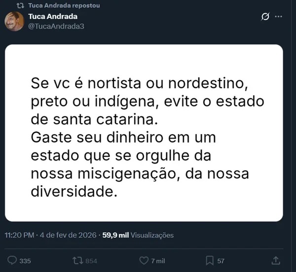 O ator Tuca Andrada gerou polêmica nas redes sociais ao fazer um apelo direto aos seus seguidores: que não visitem o estado de Santa Catarina. A declaração foi feita por meio de um vídeo publicado em seu perfil no Instagram, onde ele expressou sua indignação com o cenário político e social da região.