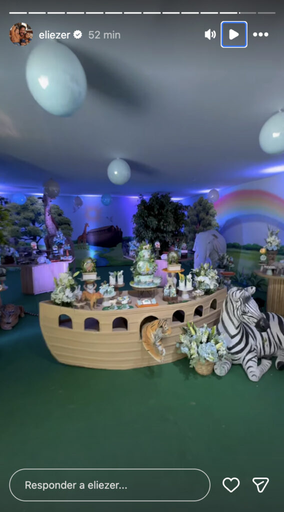 A comemoração aconteceu em uma fazendinha, escolhida para proporcionar às crianças a experiência de interagir com os animais. O espaço também contou com uma sala especialmente decorada com o tema Arca de Noé. A mesa do bolo, em formato de arca, foi o destaque do ambiente, cercada por elementos que remetiam à história bíblica, com figuras de zebras, girafas, leões e outros animais.