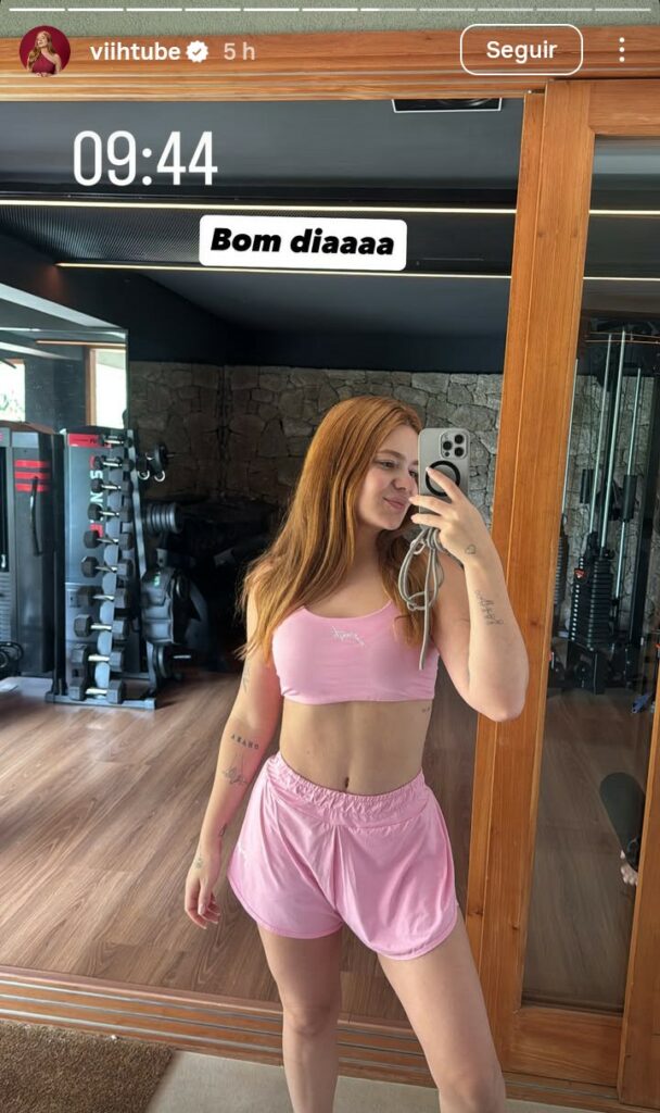A influenciadora Viih Tube chamou atenção nesta sexta-feira (16) ao compartilhar uma foto vestindo roupa de treino. Frequentadora assídua da academia em sua mansão, a ex-BBB exibiu a evolução de seu corpo após meses de cirurgias plásticas e rotina intensa de exercícios.