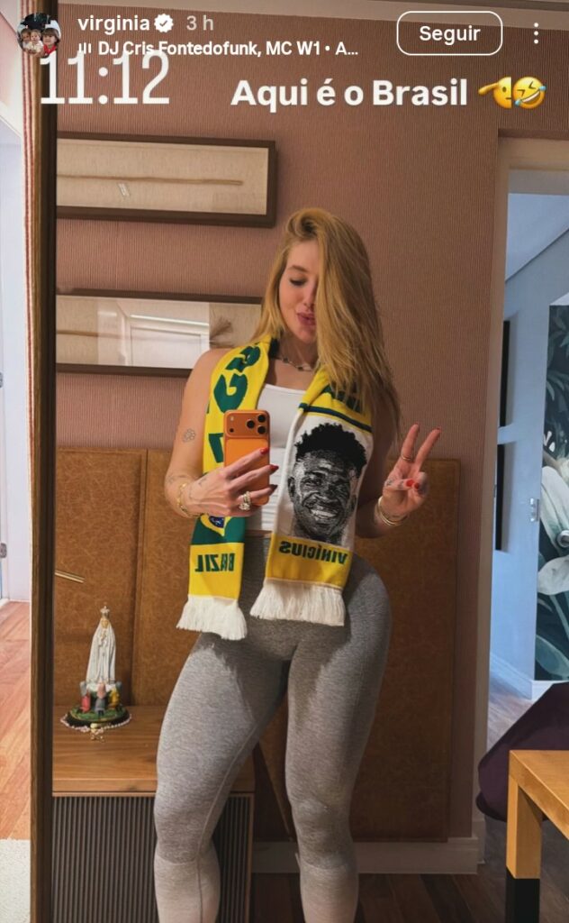 “Só para deixar registrado: essa faixa do Brasil com o rosto do Vini foi presente dele”, comentou Virginia, em tom bem-humorado, nos stories do Instagram. A influenciadora contou que o jogador até resmungou por causa do Real Madrid, mas acabou admitindo que ele mesmo escolheu o mimo. “No fim, ele gosta. Agora tenho a do Brasil e a do Real”, divertiu-se.