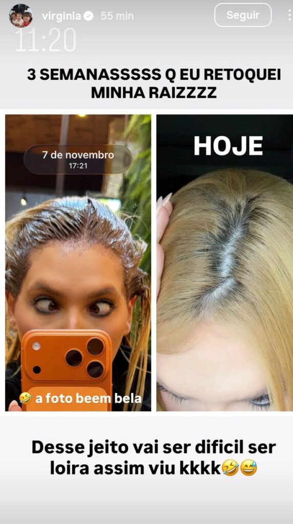 Menos de um mês após a última mudança, a loira mostrou que já precisa retornar ao salão onde cuida das madeixas. “Três semanas que eu retoquei minha raiz”, comentou, ao comparar uma foto durante o procedimento com outra evidenciando o crescimento dos fios.