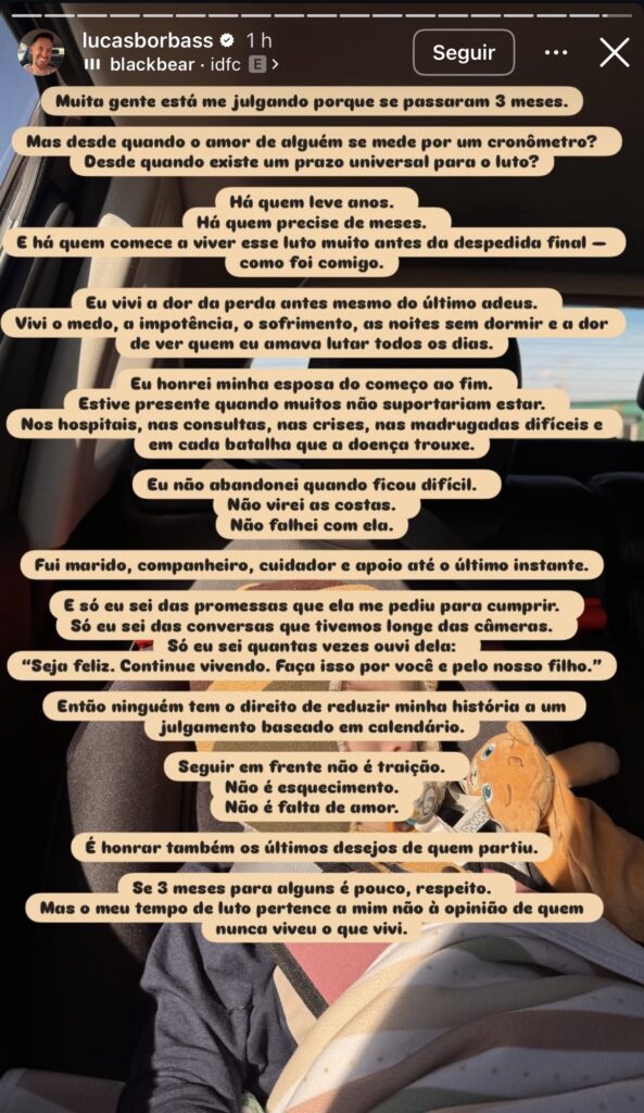 Na manhã desta quinta-feira (16/4), Lucas abriu o coração e rebateu os comentários que questionam a velocidade com que ele seguiu em frente. Para ele, o luto não é uma ciência exata e, no seu caso, o processo começou muito antes do adeus final. “Vivi a dor da perda antes mesmo do último adeus. Vivi o medo, a impotência e a dor de ver quem eu amava lutar todos os dias”, desabafou o viúvo.