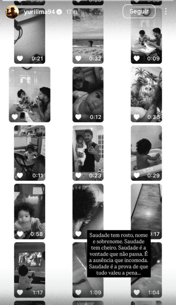 Yuri Lima, de 31 anos, usou as redes sociais nesta terça-feira (3) para fazer um desabafo emocionado sobre a saudade que sente da filha Nala, de 1 ano, fruto de seu antigo relacionamento com a cantora Iza. O jogador de futebol compartilhou um arquivo pessoal do celular com diversos registros ao lado da menina, reunindo momentos marcantes da convivência entre pai e filha.
