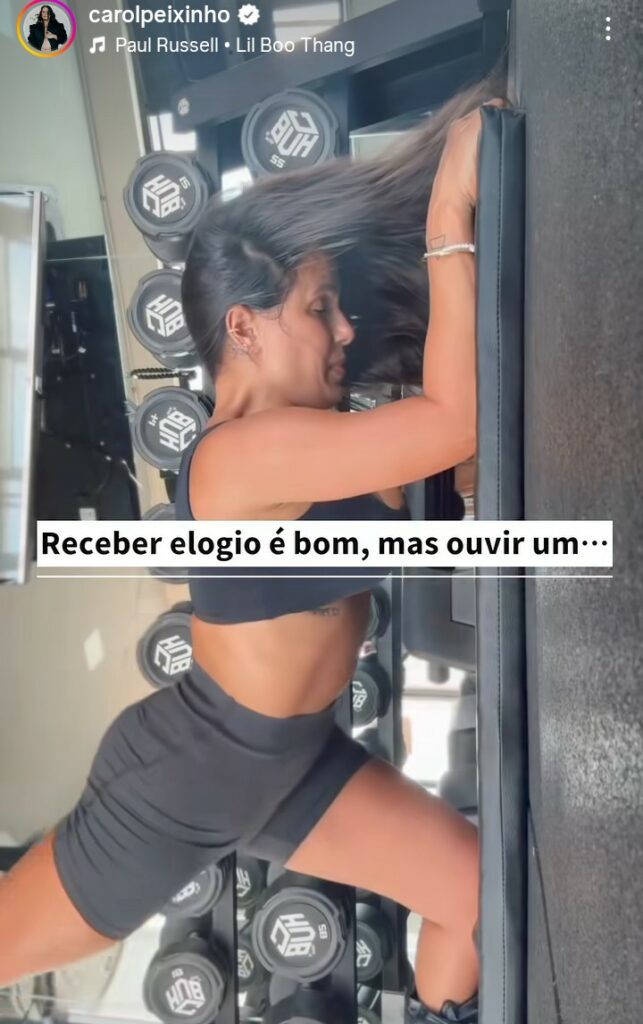Carol Peixinho, 40, recorreu ao Instagram nesta quarta-feira (10) para mostrar parte de sua rotina de treinos dois meses após o nascimento de Bento, seu filho com o cantor Thiaguinho, que veio ao mundo em 19 de setembro. No vídeo publicado, a influenciadora destacou os comentários que vem recebendo sobre a recuperação pós-parto, afirmando que, embora elogios sejam bem-vindos, ouvir que “nem parece que acabou de parir” a deixa ainda mais motivada.