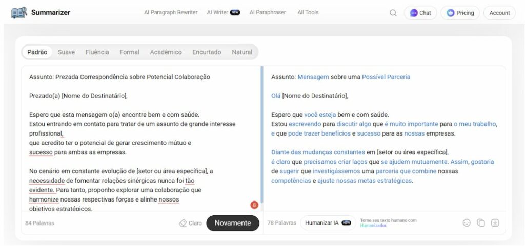 Basta colar o texto desejado na caixa de entrada de texto, selecionar o modo de paráfrase desejado e clicar no botão “ Paráfrase ” para parafrasear o texto.