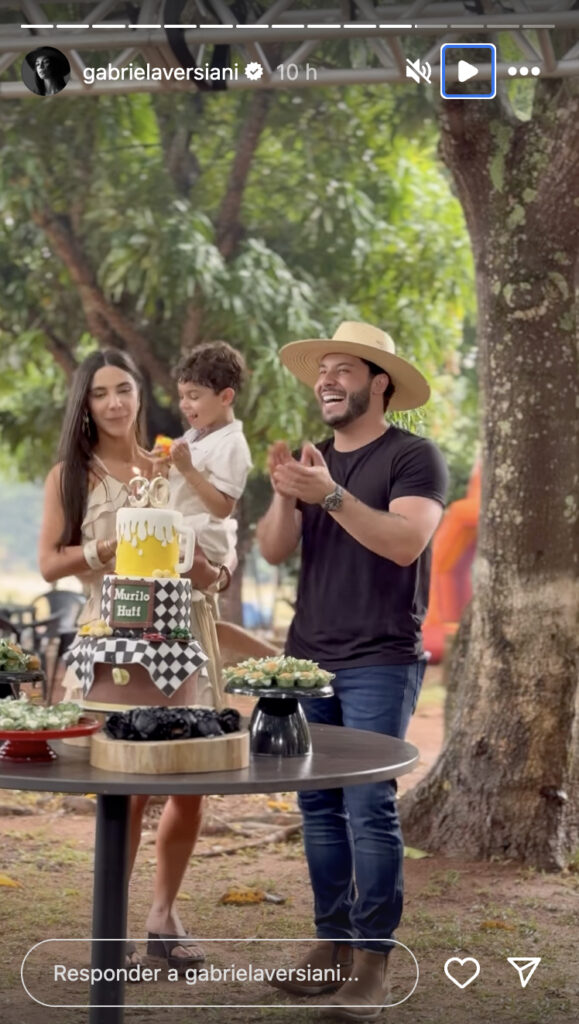 Gabriela Versiani, noiva do cantor, registrou alguns momentos da festa de aniversário nas redes sociais, incluindo a hora do Parabéns. Nas fotos, Léo aparece no colo de Gabriela, próximo ao pai, e chegou a ajudar Murilo a soprar as velas do bolo.